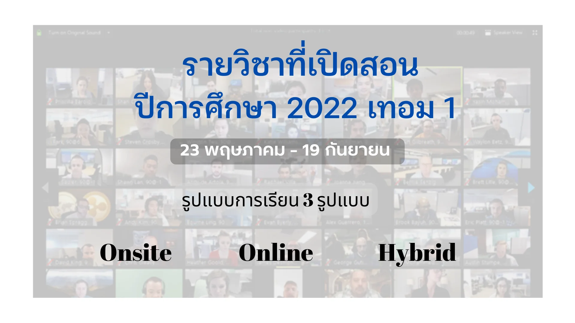 2. Hybrid (onsite + online) เปิดให้นักศึกษาไป/กลับ เลือกเรียนได้ทั้งในชั้นเรียนและผ่านโปรแกรม zoom จำนวน 20 วิชา ดังต่อไปนี้